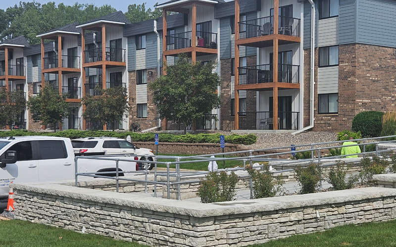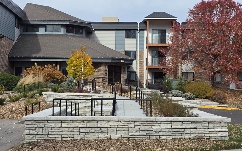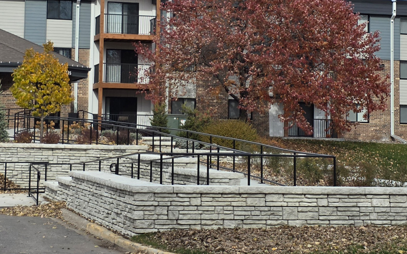 The apartment owners and contractor needed a retaining wall solution that also provided an ADA compliant ramp. By Using Novum – Alpine, and the two sided freestanding units, a wall with a texture on two sides solved the issue with stunning visual results.
